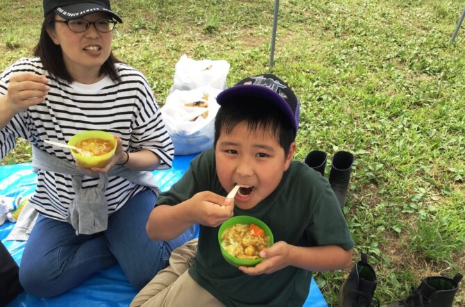 最後に、収穫物の試食として食べた「じゃがいもゴロゴロカレー」「小松菜の蒸しケーキ」が大好評!皆さん、たくさんおかわりして食べてくれました。
