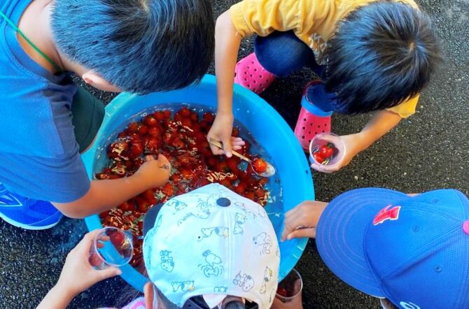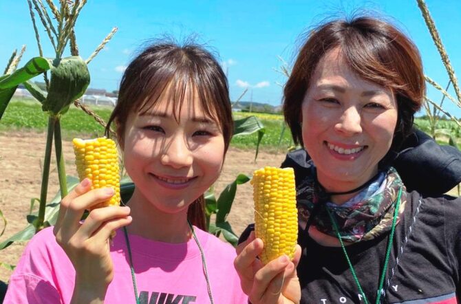 次はお楽しみのとうもろこし収穫!育ててくれたのは村悟空青年部の皆さんです。交流の日に合わせて5月の種まきから準備してくれました。畑でも収穫方法やおいしいとうもろこしの見分け方などいろいろ教えてくれました。採りたてだから味わえる「生とうもろこし」!その場で皮をむいてガブリ♪みずみずしい甘さにみんなびっくりです。