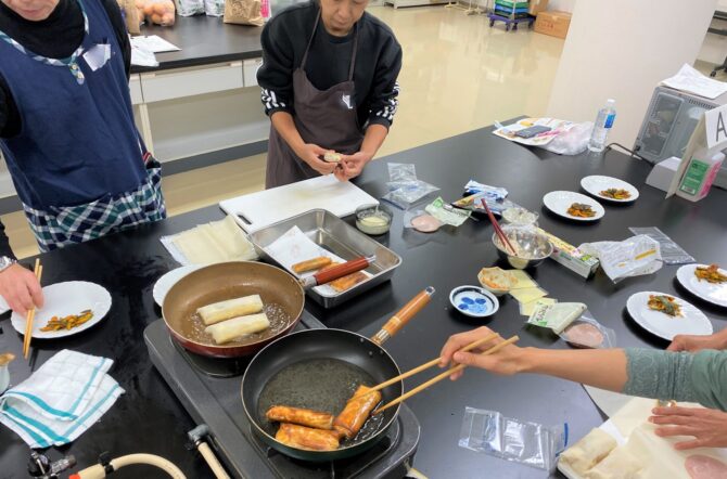 士別農園について学んだ後は、士別農園の野菜や『しべつみそ』を使った昼食交流です。グループごとに玉ねぎをたっぷり使った春巻き作り。青じそやツナ、ハム、スライスチーズなど、自宅にある材料で気軽に玉ねぎのおいしさを味わえるメニューです。