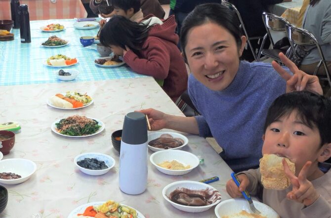 体力を使った後はお楽しみの昼ごはん。野菜たっぷりの雑煮とお餅を試食しました。皆さんお代わりしながらたくさん食べていました。