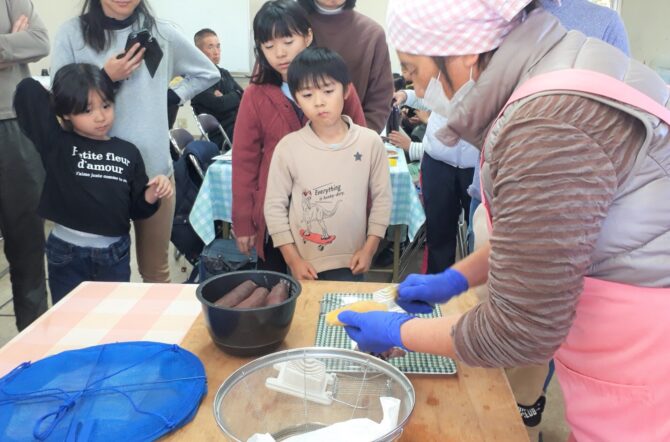食後は佐原農産物供給センターの女性部「農め~くくらぶ」の方から“干し芋”の作り方を教わりました。皆さん、興味深く聞いていました。