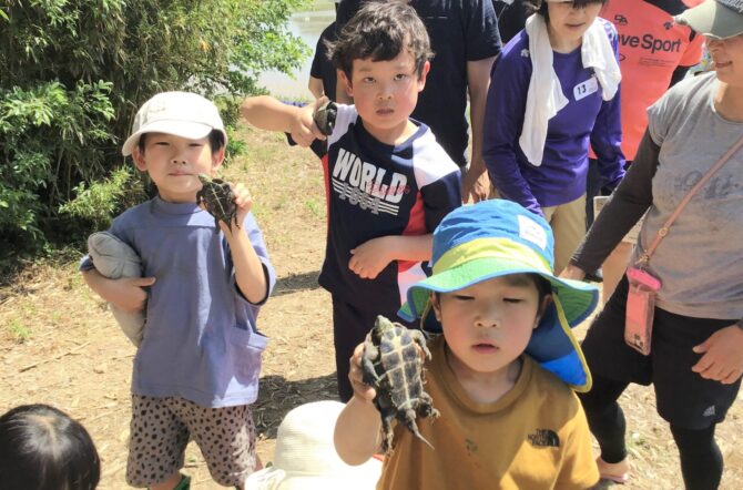 生産者の増田さんが事前に仕掛けておいた網に何が掛かっているかな…。たくさんのカメを見つけて子どもも大人も目がキラキラと。興味深く観察したり、恐る恐る触ったりしていました♪