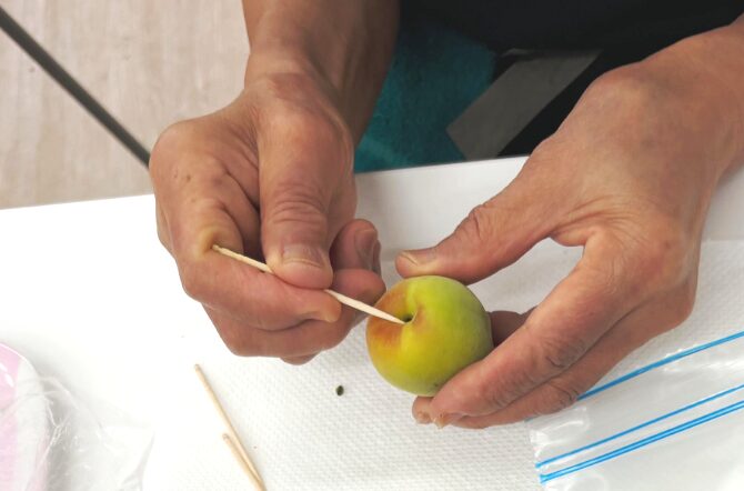 いよいよ「梅しごと」スタート。参加者は、きれいに洗われた梅の実のなり口(=ヘタの部分)をつまようじで取り除き、ポリ袋の中で塩漬けにしました。あとは各自が家に持ち帰って梅干しを完成させます。