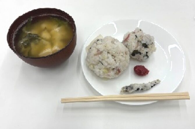 さて、もう1つのお楽しみ。この日の試食には、梅干しを炊きこんだごはんのおにぎりと、煮干しでだしをとった高野豆腐とわかめのみそ汁です。乾物の高野豆腐の食感も良く、やさしい味でおいしいと好評でした。だしをとったあとの煮干しも丸ごと無駄なく「お魚食べよう」ということで、片栗粉をまぶして揚げ焼きにして、希望者に試食していただきました。