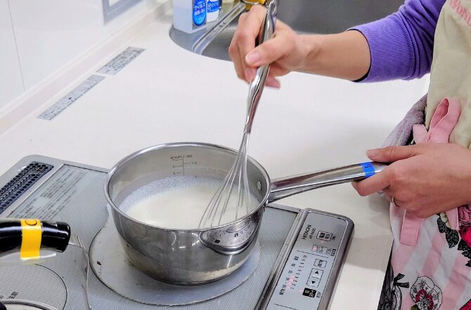 お米と米粉について学んだら、米粉と豆乳を使って簡単に作れるもちもちしっとりの和風スイーツを楽しみましょう♪