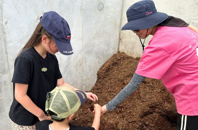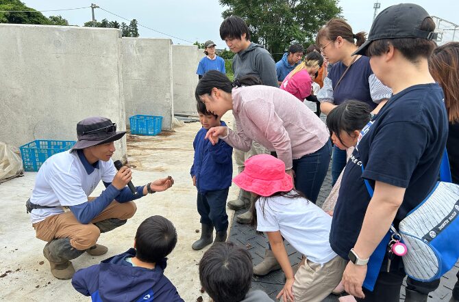 椎名農場長からは堆肥のお話を伺いました。馬のフンが菌によって、サラサラできれいな堆肥に変わっていく様子を、見て触って実感しました。