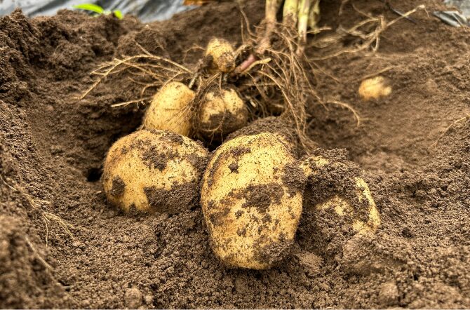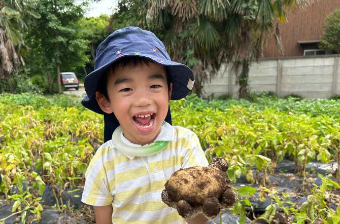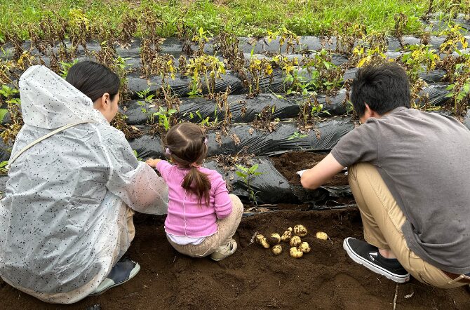 土を掘ると、立派に育ったじゃがいもがたくさん!ゴロゴロと出てきました。さまざまな大きさ、形があることに感動を覚えながら、一生懸命掘りました。どんな料理で食べようかな~と楽しい家族の会話もはずみます。