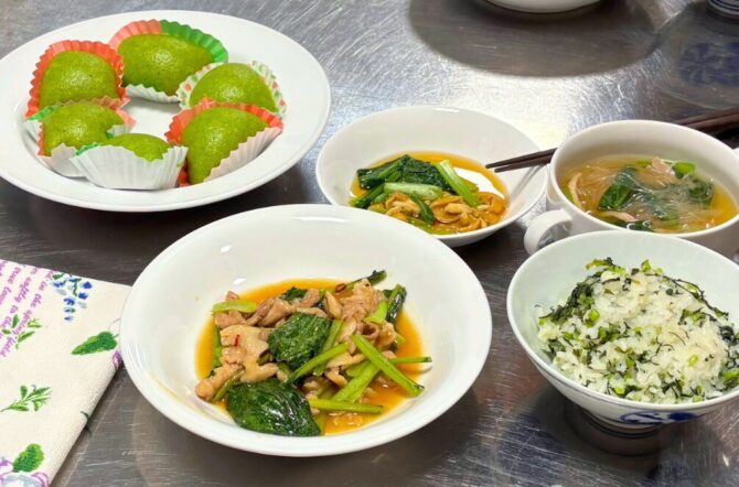 調理実習では代表品目の小松菜をたーっぷり使って「菜飯」「蒸しケーキ」「豚肉と小松菜の南蛮炒め」「なめこと小松菜のおひたし」「小松菜とハムの春雨スープ」「小松菜とバナナのスムージー」を作りました。