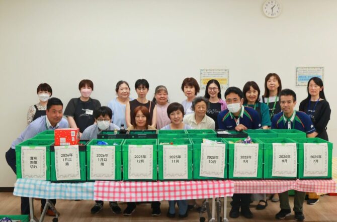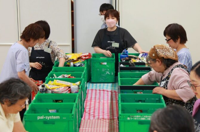最後にフードドライブへの取り組みで組合員の皆さんから寄せられた寄贈品の仕分け作業をしてもらいました。