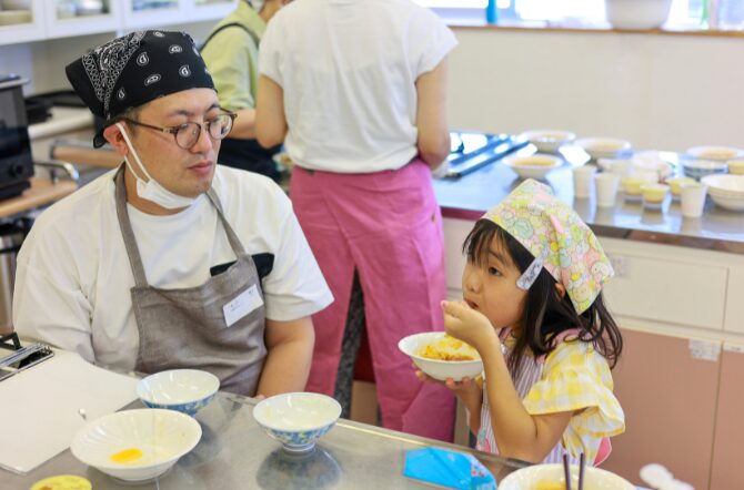 「野菜はカットされていたし、メニューが決まっていたので作りやすかったです」「思った以上に上手にできました!」「 パパの料理、どう?」「おいしいよね?上手にできたよね!」など、おしゃべりしながら楽しく作っていた親子もいました。