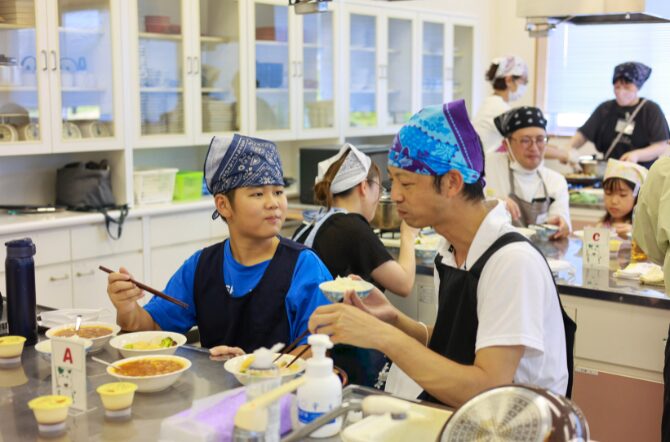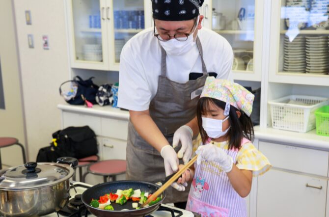 8月23日(土)、九十九里町にある「つくも学遊館」にて『~夫もパパもお料理体験~パパと子どものわくわくクッキング♪』を開催しました。男性がもっと気軽にキッチンに立てるよう、応援したい! そんな気持ちから、初心者でも簡単にできる「お料理セット」に親子でチャレンジする企画です。
