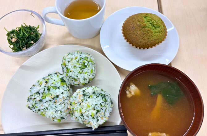菜飯のおにぎりは小松菜を細かく刻み、たっぷり混ぜこみました。若芽ひじきの和え物は、食べたことのない人もおいしいと絶賛!みそ汁にはグリーンボックスの野菜と産直豚で具だくさんに♪ 小松菜ケーキは「香ばしくてとてもおいしい」「家で家族に食べさせたい」と多くの声が上がりました。