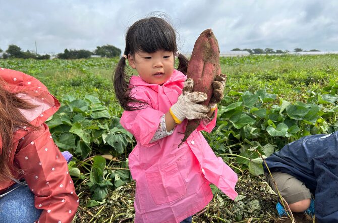 外の畑ではさつまいもの収穫体験もありました。みんな泥んこになりながらもたくさんのさつまいもを掘っていました。
