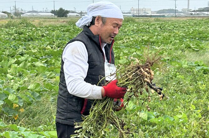 続いて落花生の収穫です。落花生のなり方を、サンドファーム旭代表の金谷さんに説明していただきました。