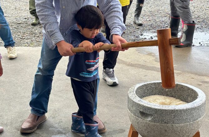 昼食はお餅です!きなこ餅、あんこ餅、お雑煮と餅三昧♪餅つきは、子どもも大人も楽しんで体験していました。