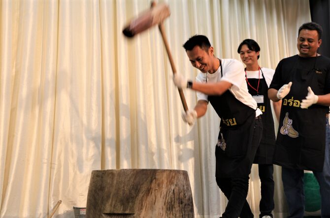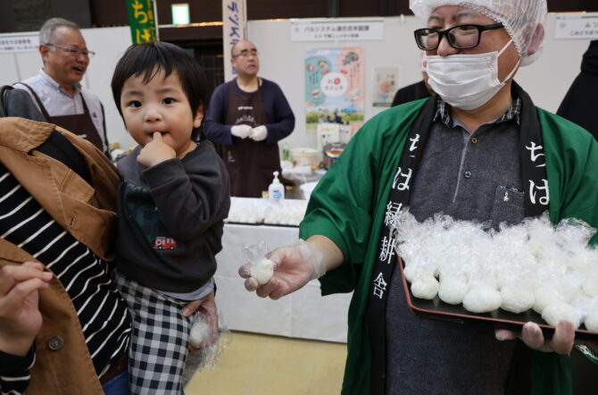 ステージでは、ちば緑耕舎の生産者による餅つきやこんせんくんとの撮影会が行われ、ご家族連れを中心に多くの方にご参加いただきました。餅つきにはタイからお越しいただいた「ホムトンバナナ」の生産者の皆さんも参加して大いに盛り上がりました。