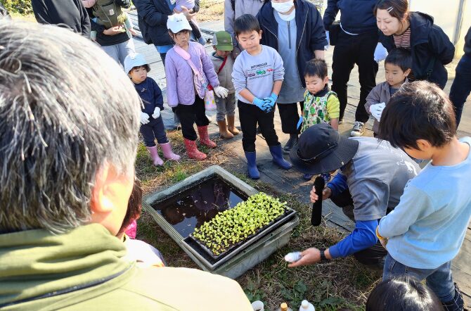 レタスの苗を前に、有機質肥料を与えて育てているという話を聞きました。小さい苗には子どもも興味津々!