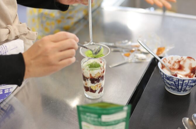 この企画のコンセプトは「いつも頑張っているママたちにゆっくりしてほしい」です。お子さんは保育に預け、調理実習は「和風パフェ」の盛り付けだけということで、食材を飾る順番やレイアウトの話に花が咲きました。