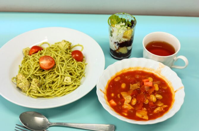 ほかに試食したのは、子育てサポーターの協力も得て用意していた「めかじきのジェノベーゼパスタ」と「豆たっぷりスープ」。大人向けの栄養たっぷりの食事を堪能しました。