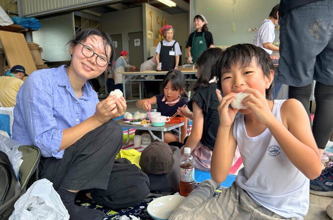 そしてお待ちかねの昼食は、「新米」と「豚汁」「若芽ひじきのナムル」「カクテキ」です。新米の甘みといったら…塩むすびでいくらでも食べられそう。今年初めての新米だったご家庭も多かったのではないでしょうか。田んぼで作業した後に食べる新米は、さらにおいしさを感じました。
