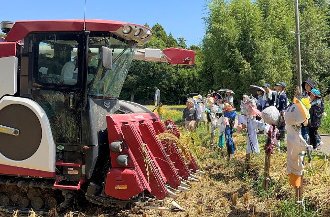 続いて「コンバイン」の登場です。現在はこれを駆使して稲刈りをします。間近で見ると、その大きさと迫力に圧倒されました。