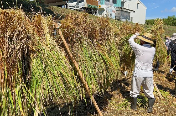 束にした稲を運んで稲架(ほだ)にかけてもらいました。現在は機械を使うそうですが、昔はこうして自然乾燥させていたそうです。