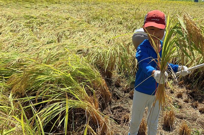自分たちで田植えや草とりをしたこともあり、実りと収穫の喜びがあふれます。鎌の扱いがむずかしかったり、“ほだがけ”にするために稲をひとまとまりに結ぶのが大変だったりしましたが、終了の呼びかけがあっても「まだやりたい!」という声がたくさん聞こえてきました。