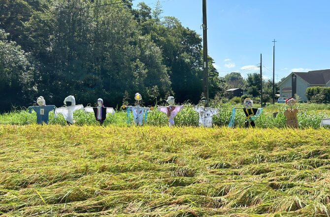 6月の草とりでは緑色だった田んぼが一面きれいな金色に。「お米がついている!」と気持ちが高まります。前回自分たちで作ったかかしたちに見守られながら、鎌の使い方を教えていただき、いよいよドキドキの手刈りスタートです。