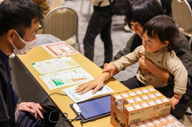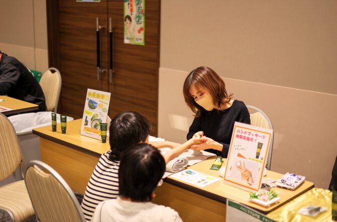 子どもの食育や保護者向けの栄養講座など育児に役立つ情報をお届けしました。癒しのハンドマッサージコーナーでは、お子さんたちが体験するようすも見られました。