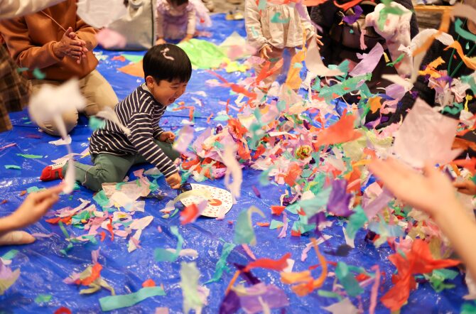 木のおもちゃや「巨大お絵かき」のキャンパスは子どもたちに大人気。花紙あそびやコースター、チャーム作りなどの工作コーナーでは、自分だけの作品をお土産としてお持ち帰りいただきました。