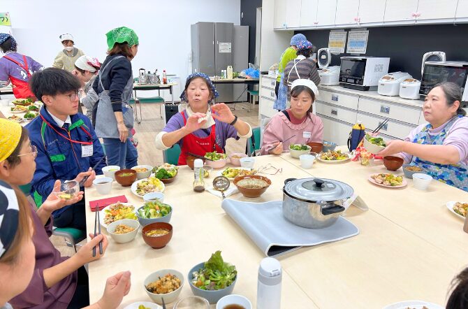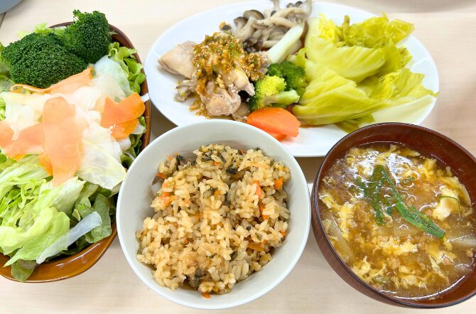メニューは「人参ごはん」「大根とひき肉のあんかけスープ」「鶏肉と冬野菜の蒸し物」「シンプルサラダ」です。どの料理もお野菜本来のおいしさが引き立つレシピで大好評!満腹になりました。
