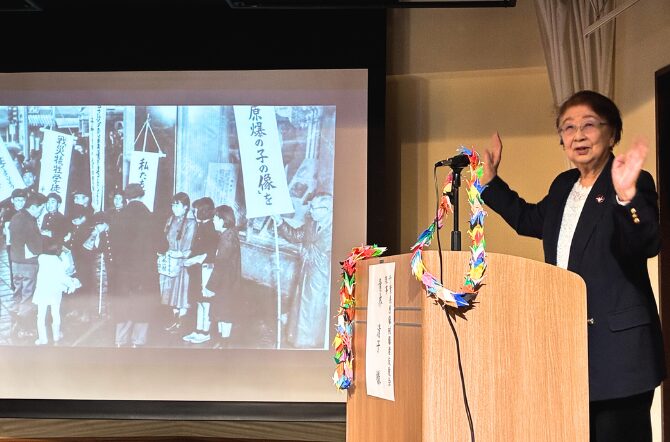続いて登壇したのは、千葉県原爆被爆者友愛会 理事の青木清子さん。「被爆体験と平和への願い」と題して、当時4歳で被爆した体験と、その後の小中学校での被爆体験を語る活動についての講演がありました。2024年に日本被団協がノーベル平和賞を受賞した際のオスロツアーの様子などのお話もありました。