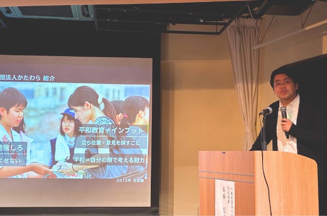 最後は、一般社団法人かたわら代表理事の高橋悠太さんによる講演「私たちの社会は私たちの手で作っていこう」でした。平和をつくるための仕事が必要と考え、法人を立ち上げ、学校での平和教育事業や議員への政策提言などの活動をされています。