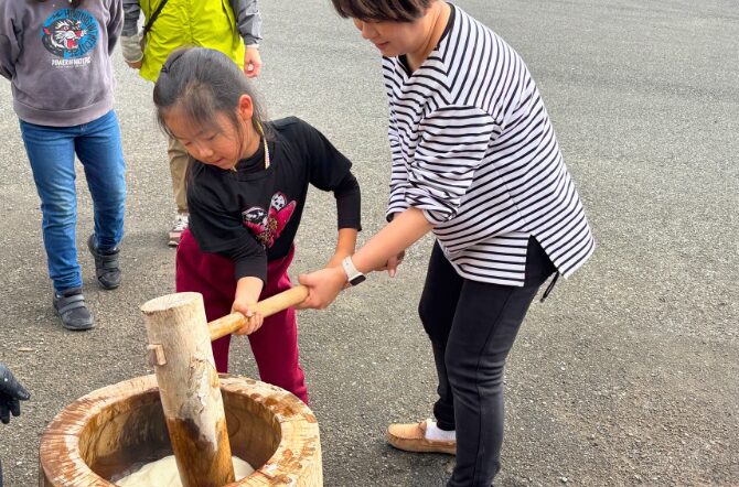 餅つき体験。見た目より重い杵を持ち上げてぺったん。