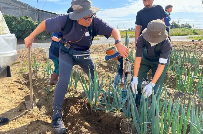 交流圃場では、最初に「ライン引き」をしました。手植えの際にまっすぐ植えるために線を引きます。これは江戸時代からの農法で、均等な間隔をあけてまっすぐに植えることで、風通しが良くなり病気にもかかりにくくなります。今後の作業や収穫量にも影響するので、しっかりと一定の間隔を保って植えることが重要です。