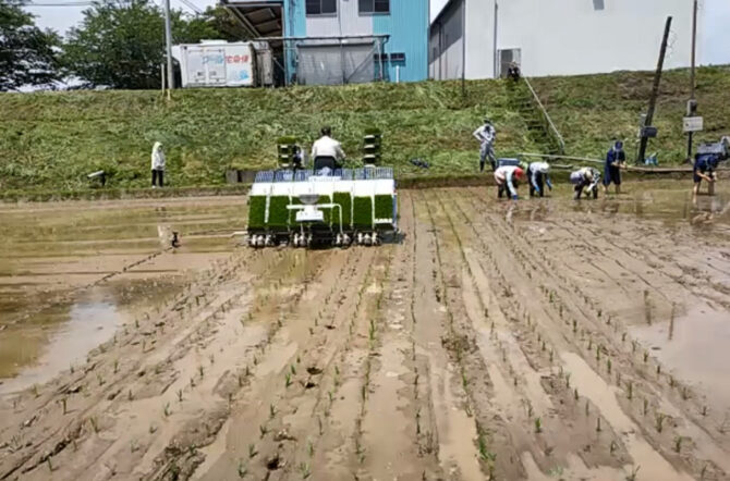 向かって右側が手植え、左が田植え機です。