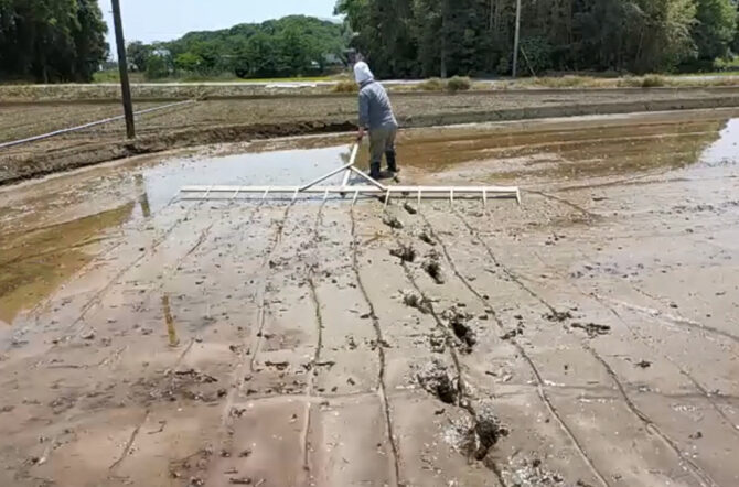 交流圃場では、最初に「ライン引き」をしました。手植えの際にまっすぐ植えるために線を引きます。これは江戸時代からの農法で、均等な間隔をあけてまっすぐに植えることで、風通しが良くなり病気にもかかりにくくなります。今後の作業や収穫量にも影響するので、しっかりと一定の間隔を保って植えることが重要です。