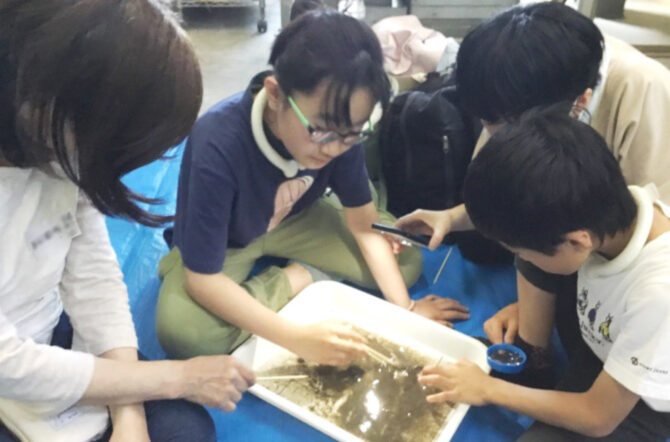 生きもの調査では、栽培方法の異なる田んぼの土のイトミミズやユスリカの数を数えました。環境保全型農業に取り組んでいる田んぼの方が、小さな生きものがたくさんいることがわかりました。