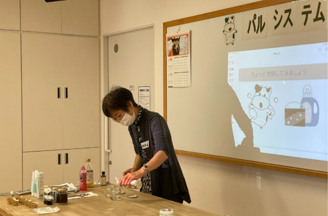 PLA(※)の鷺沼さんから、パルシステムの石けんの取り組みや、オリジナルブランドの歯みがきについて説明していただきました。