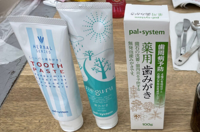 合成界面活性剤・防腐剤・フッ素を使用しないPB歯みがきについても学習します。