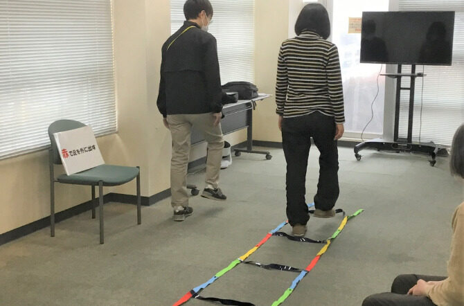 4色あしぶみラダーは、色に合わせて手足を動かすのですが、思った以上にできない!でも「間違ってもいいんです、考えながら体を動かすことが大事なんです」との声掛けをいただき、安心して?間違えながら皆さんと楽しく笑い合いながら体験しました。