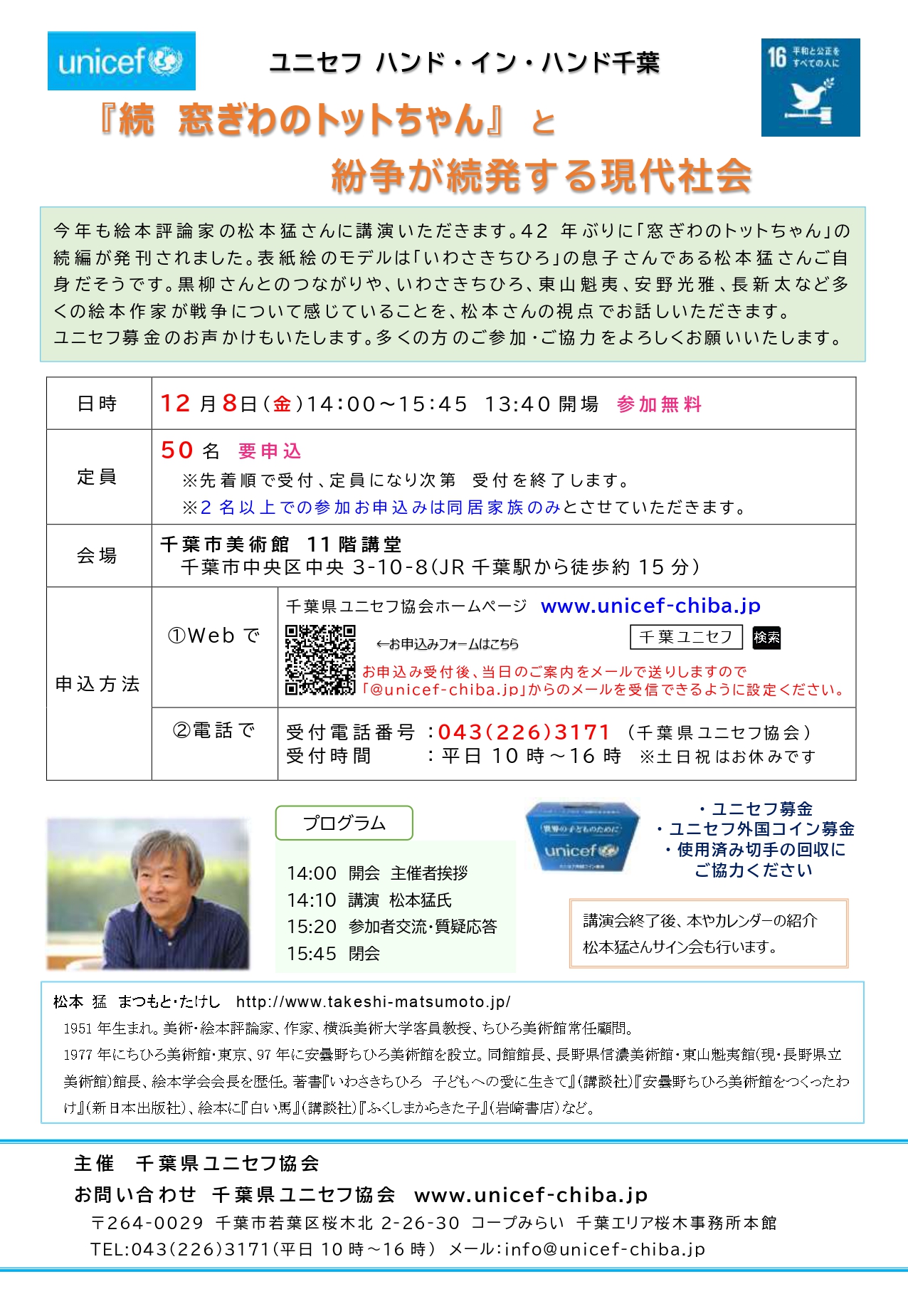 今年も絵本評論家の松本猛さんに講演いただきます。42年ぶりに「窓ぎわのトットちゃん」の続編が発刊されました。表紙絵のモデルは 「いわさきちひろ」の息子さんである松本猛さんご自身 だそうです。黒柳さんとのつながりや、いわさきちひろ、東山魁夷、安野光雅、長新太など多くの絵本作家 が 戦争について感じていることを、松本さんの視点でお話しいただきます。ユニセフ募金のお声かけもいたします。多くの方のご参加 ・ご協力をよろしくお願いいたします。