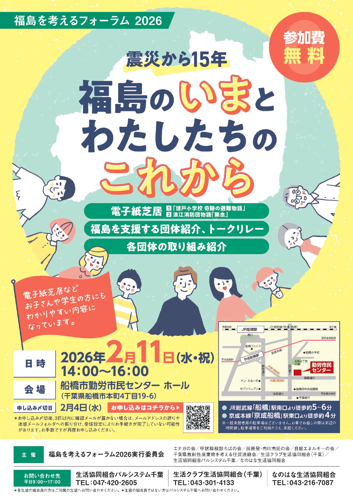 | 主催 | 主催:福島を考えるフォーラム2026実行委員会 エナガの会/甲状腺検診ちばの会/脱原発・市川市民の会/自給エネルギーの会/千葉県放射性廃棄物を考える住民連絡会/生活クラブ生活協同組合(千葉)/生活協同組合パルシステム千葉/なのはな生活協同組合 |