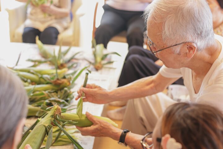 1日定員17名の小規模デイサービスで、来ていただいた方にはそれぞれができることをなるべくご自身で行ってもらいながら過ごしていただき、役割をもって過ごせるように支援をしています。