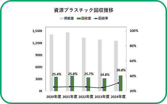 カタログの回収率が89.5%なのに対し、カタログや商品のまとめ袋等の資源プラスチックの回収率は30.8%しかありません。