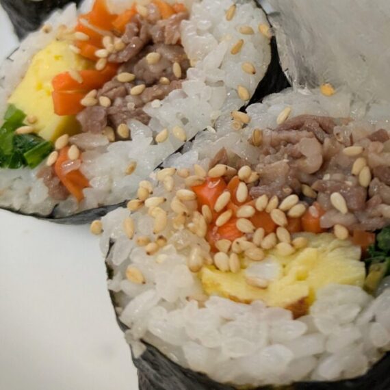 - 巻きすにのりとごはんを広げ、真ん中に肉がくるように並べて巻く。