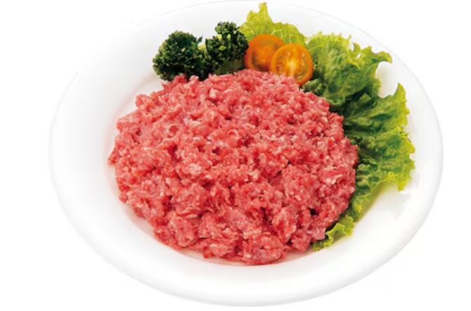 牛肉と豚肉を、7:3の比率で合わせたひき肉です。牛肉・豚肉とも、産直を主体とした国産肉が原料。さまざまな部位を有効に活用しながらバランスよく配合するために、冷蔵肉と冷凍肉の両方を使用しています。牛肉のうまみと豚肉の口あたりのよさの両方を楽しめる合びき肉は、定番のハンバーグやピーマンの肉詰めのほか、ミートソースやチリコンカン風炒め物など洋風料理に活躍します。