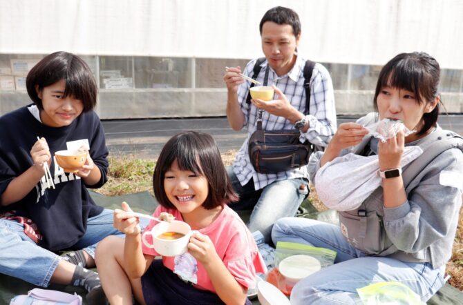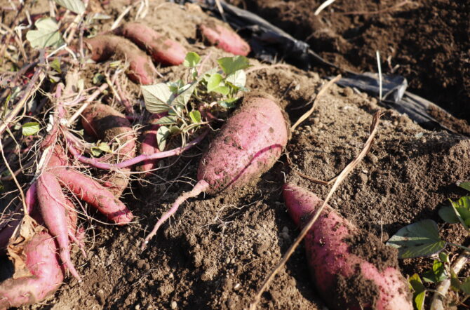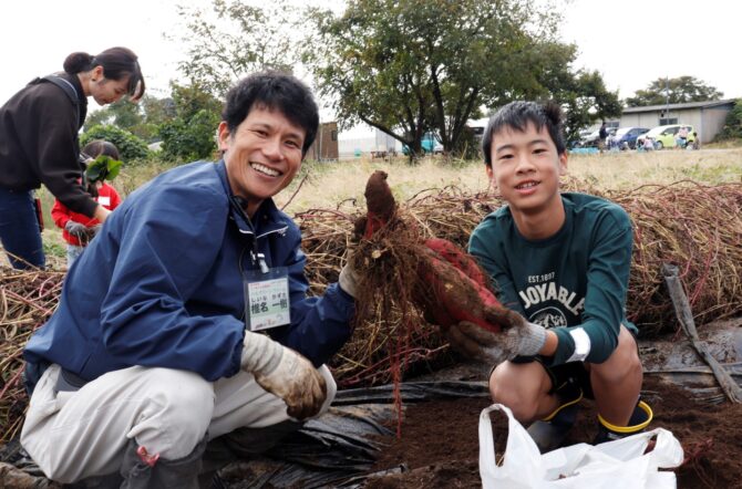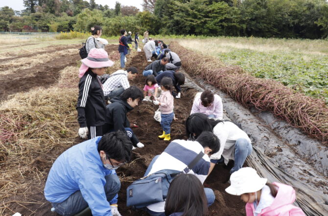 10月14日(土)、28日(土)にさつまいも収穫体験&交流会を行いました。今年は6月に大雨、以降は猛暑日続きで雨が少なく作柄が心配でしたが、無事に組合員の皆さんを受け入れることができてよかったです。収穫体験では子どもから大人まで泥んこになりながら、さつまいもを袋いっぱいに収穫して持ち帰っていただきました。中には尻もちをついてしまいお尻に泥が付いている方もいて、皆さん、笑顔で楽しんでいただけたと思います!