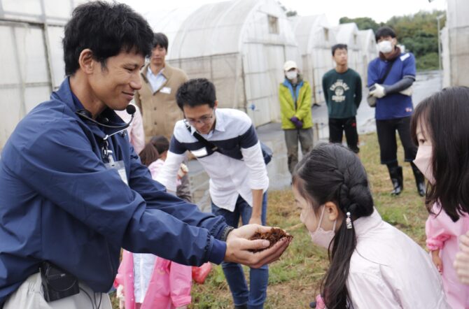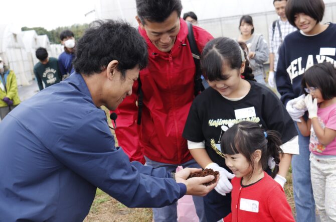 また交流会では、栽培方法についても紹介しました。今年度から馬の糞尿を原料にした堆肥づくりを始めていますが、糞尿であることを説明した後、実際に堆肥を触ったり、臭いを嗅いだりしていただきました。最初のうちは警戒していた子どもたちも、恐る恐る堆肥に触ってみると「あったかーい!」と言って、山積みされた堆肥を掘ったり握ったりする様子が印象的でした。こうした体験を通して「農」やパルグリーンファームとのつながりが深まると嬉しいです。
