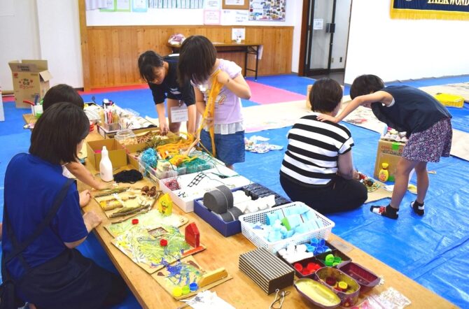 作品ができ上がると、それぞれ「〇〇賞」「△△賞」と自由な発想で決めた賞状を贈り合い、お互いに鑑賞して感想を交わすなど楽しい雰囲気でイベントを終えました。完成した作品は地元の商店街に飾り、地域ともさらにつながることができました。